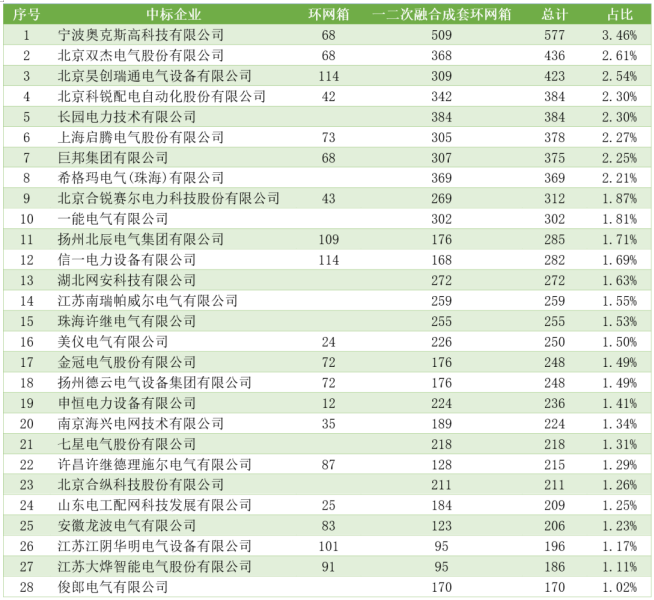 表2國(guó)網(wǎng)環(huán)網(wǎng)箱產(chǎn)品中標(biāo)企業(yè)(市場(chǎng)份額超越1%部分)