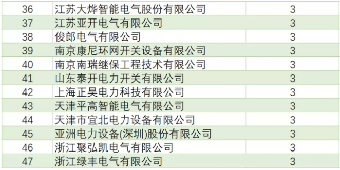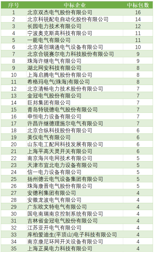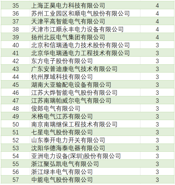 表4國(guó)網(wǎng)環(huán)網(wǎng)箱產(chǎn)品中標(biāo)企業(yè)中標(biāo)項(xiàng)目單位數(shù)(中標(biāo)項(xiàng)目單位數(shù)超過3個(gè)部分)