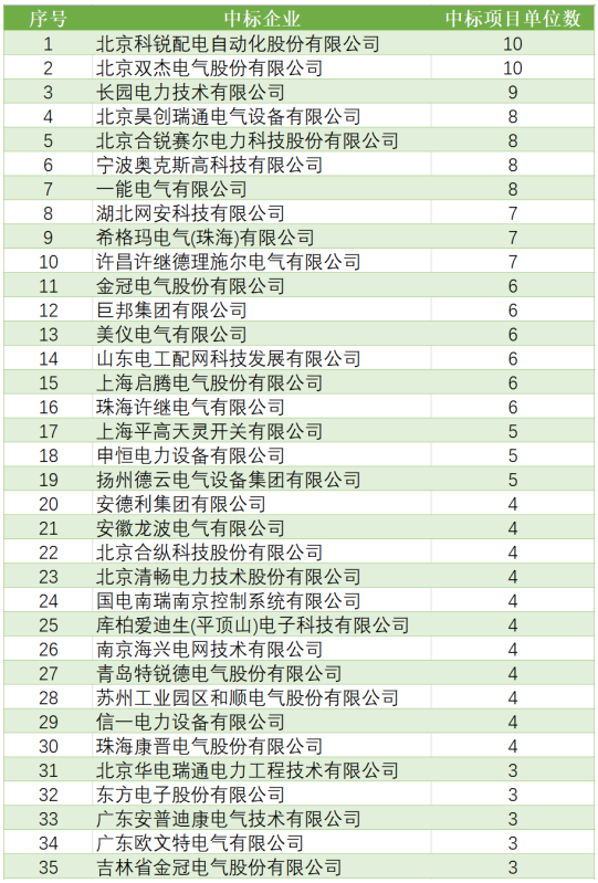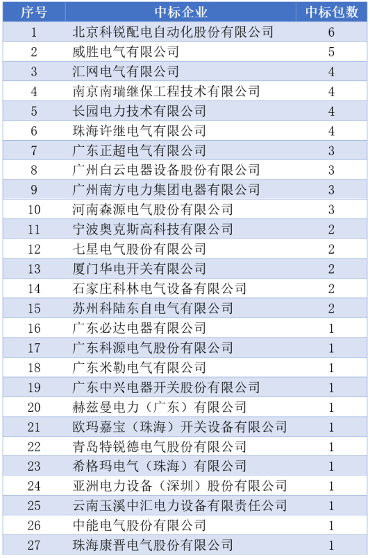 總體中標(biāo)數(shù)量方面,北京科銳配電自動(dòng)化股份有限公司中標(biāo)金額到達(dá)約2億元;還有4家企業(yè)超越約1億元。