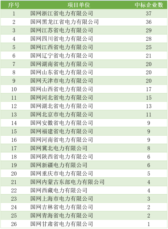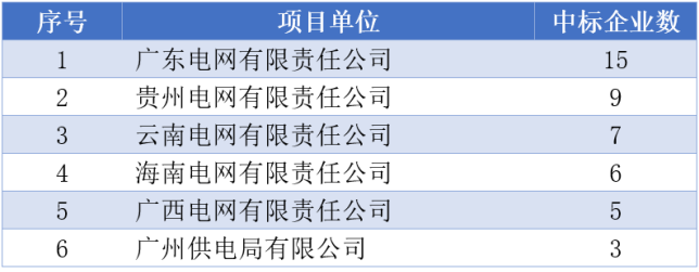 各電力公司中標(biāo)企業(yè)數(shù)量方面,在廣東電網(wǎng)公司共有15家企業(yè)中標(biāo),全部項(xiàng)目單位都有超32家企業(yè)中標(biāo)。