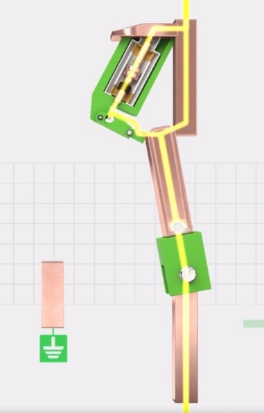 然后,電流通過處于閉合方位的真空滅弧室。接下來,在動觸頭的推動下,樞軸桿旋轉(zhuǎn)并驅(qū)使真空滅弧室開斷。