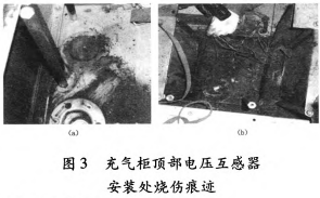 檢查35kV垣潔線56號(hào)線路電壓互感器上端柜頂,發(fā)現(xiàn)柜頂插拔處燒損,斷路器室壓力釋放裝置動(dòng)作。將壓力釋放通道打開后,發(fā)現(xiàn)本柜斷路器室壓力釋放盤動(dòng)作,壓力釋放通道有大量燃弧噴出的落塵。打開斷路器室入孔后,發(fā)現(xiàn)氣室內(nèi)有燃弧痕跡。氣室內(nèi)其它絕緣件未受損,銅排和柜體表面有落塵無(wú)燒傷痕跡,如圖3所示。