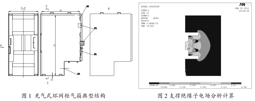 高壓帶電體對地最小間隙處在支撐絕緣子上,通過計算支撐絕緣子的電場如圖2,滿足電場要求,最終確定對地最小間隙。依據(jù)最小間隙準則確定氣箱外形尺寸(L1xW1xH1)。