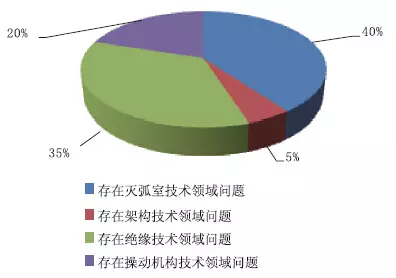 通過對固體絕緣環(huán)網(wǎng)柜中心技能問題的了解,以為存在滅弧室技能領(lǐng)域問題的占比40%;以為存在架構(gòu)技能領(lǐng)域問題的占比5%;以為存在絕緣技能領(lǐng)域問題的占比35%;以為存在操動組織技能領(lǐng)域問題的占比20%。如圖9所示。