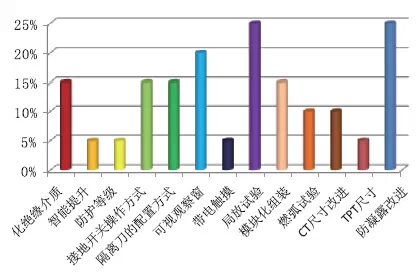 通過調(diào)研被參加者心中新產(chǎn)品哪些部分應(yīng)當(dāng)進(jìn)行優(yōu)化,以為應(yīng)優(yōu)化絕緣介質(zhì)部分的占比15%,智能提升部分的占比5%,防護(hù)等級部分的占比5%,接地開關(guān)操作方法的占比15%,阻隔刀的配置方法的占比15%;可視觀察窗的占比20%,帶電接觸的占比5%,局放實驗的占比25%,模塊化拼裝的占比15%,燃弧實驗的占比10%,CT尺寸改進(jìn)的占比10%;TPT尺寸的占比5%,防凝露改進(jìn)的占比25%。如圖15所示。