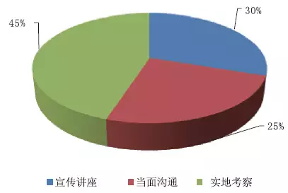 通過了解參加者了解新產(chǎn)品知識的途徑,以為最有用的方法中:宣揚(yáng)講座的占比30%;能夠通過當(dāng)面溝通的占比25%;能夠參加實地考察的占比45%。如圖16所示。
