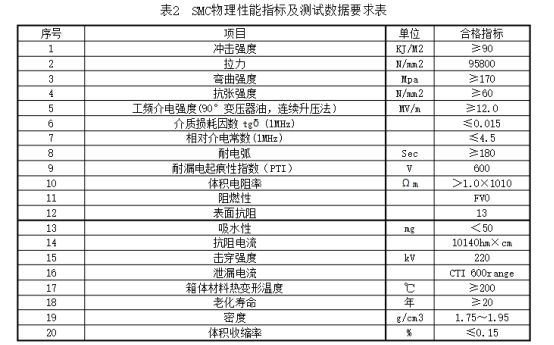 2.3.1分支箱外殼選用S304不銹鋼材料,箱體、門體材料厚度均不該小于2毫米,或SMC復(fù)合材料箱體,SMC物理功用目標(biāo)及測試數(shù)據(jù)滿意表2的要求。