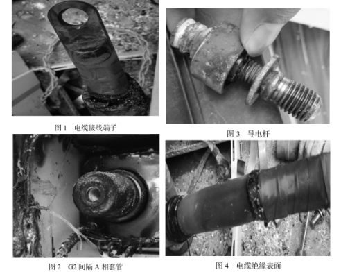 搶修人員對(duì)G2距離電纜撤除后,發(fā)現(xiàn)電纜接線(xiàn)端子(如圖1所示)氧化嚴(yán)峻,闡明此處遭受過(guò)高溫腐蝕,并且應(yīng)力錐靠近端子處的燒蝕痕跡也闡明晰插頭受高溫腐蝕;現(xiàn)場(chǎng)發(fā)現(xiàn)端子與環(huán)氧套管銅件的觸摸面存在顯著氧化,闡明高溫腐蝕時(shí),端子與環(huán)氧套管銅件外表并未徹底嚴(yán)密貼合;查看套管內(nèi)部螺紋亮光正常(如圖2所示),闡明導(dǎo)電桿裝置緊固。環(huán)氧套管遭受高溫痕跡顯著,且銅件外表與端子觸摸面也有很顯著氧化痕跡,闡明在高溫發(fā)生時(shí),端子與環(huán)氧套管銅件外表并未徹底嚴(yán)密貼合;現(xiàn)場(chǎng)對(duì)導(dǎo)電桿(如圖3所示)進(jìn)行查看,發(fā)現(xiàn)變徑螺桿氧化,以及銅嵌件脫離環(huán)氧,熔融附于變徑螺桿上,都闡明此處經(jīng)受過(guò)高溫傳導(dǎo);對(duì)電纜應(yīng)力錐剝除后,發(fā)現(xiàn)電纜絕緣外表(如圖4所示)無(wú)顯著爬電痕跡,闡明應(yīng)力體部位未發(fā)生爬電毛病,從絕緣受高溫腐蝕和燒蝕判斷,高溫來(lái)自端子部位。