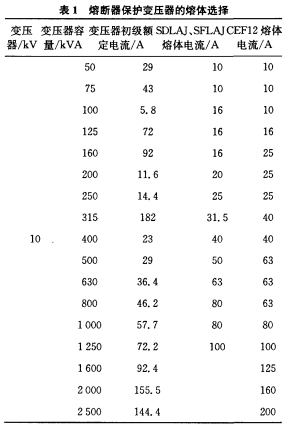 根據(jù)1989年世界配電網(wǎng)會議提供的資料,當油浸變壓器內(nèi)發(fā)生短路缺陷時,短路電弧會使油氣構成氣泡而占有原先歸于油的空間,油將壓力傳給變壓器外璧,跟著短路的持續(xù)而壓力愈來愈大,直到油箱炸裂。要使油箱不被炸裂,必須在20ms內(nèi)切除缺陷。斷路器的動作時刻是維護動作時刻和斷路器固有動作時刻兩部分之和,其值不小于60ms,可見斷路器不能抵達維護油浸變壓器的意圖。負荷開關+熔斷器環(huán)網(wǎng)柜則可以有效地維護變壓器,熔斷器維護變壓器的熔體挑選表1。