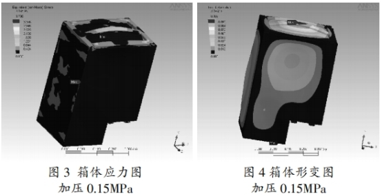箱壁厚度滿足資料的許應(yīng)應(yīng)力請(qǐng)求及氣箱允許變形量請(qǐng)求。經(jīng)過軟件剖析核算后得到氣箱的應(yīng)力散布(見圖3)及箱體形變(見圖4),終究找到氣箱壁厚。