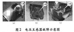 2012年3月26日,檢修人員連夜對35kV垣潔線56號線路電壓互感器進行拆除檢查,發(fā)現(xiàn)電壓互感器A、B、C相損壞,A、B相有炸裂現(xiàn)象;B相PT危害嚴峻,側(cè)壁脫離本體,插頭掉落,繞組徹底毀損;A相PT插頭掉落,表面漆層及噴鋁層受損;C相表面漆層及噴鋁層受損,其它部位正常,如圖2所示。
