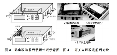 3.2在設(shè)備本體進(jìn)風(fēng)孔加防塵網(wǎng),避免塵土進(jìn)入設(shè)備內(nèi)部,設(shè)備維護(hù)人員定時(shí)對濾網(wǎng)間斷清掃,然后減輕元器件外表覆塵,利于設(shè)備正常散熱,如圖3所示加裝防塵網(wǎng)后開關(guān)電源標(biāo)明圖。對設(shè)備施行上述改善后,其改善前后對比如圖4所示。