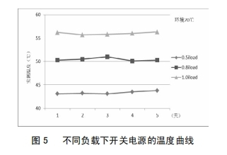 改善后,為考證改善作用,對開關(guān)電源分別在0.5倍、0.8倍及1.0倍負(fù)載下間斷了為期5天的帶負(fù)荷實(shí)驗(yàn),圖5為不同負(fù)載下開關(guān)電源的溫度曲線,由圖5可知,跟著負(fù)荷的增大,開關(guān)電源問題整體呈上升趨向;負(fù)載不變的情況下,同一溫度曲線根柢堅(jiān)持滑潤;開關(guān)電源在額定負(fù)載下作業(yè),最高溫度不超越57℃,未達(dá)報(bào)警值,開關(guān)電源牢靠性得到明顯前進(jìn)。